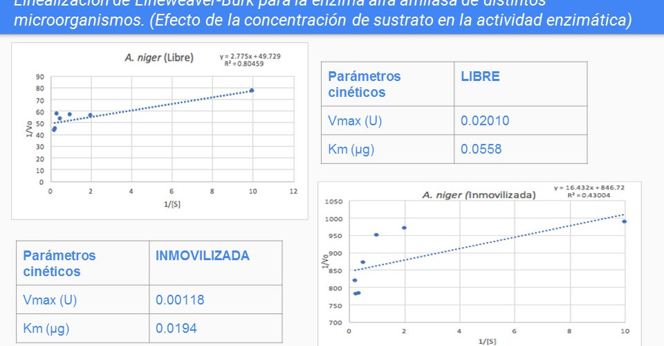A continuación se presenta la siguiente tabla con los resultados obtenidos de Vmax y Km de los distintos extractos libre e inmovilizados de alfa amilasa: